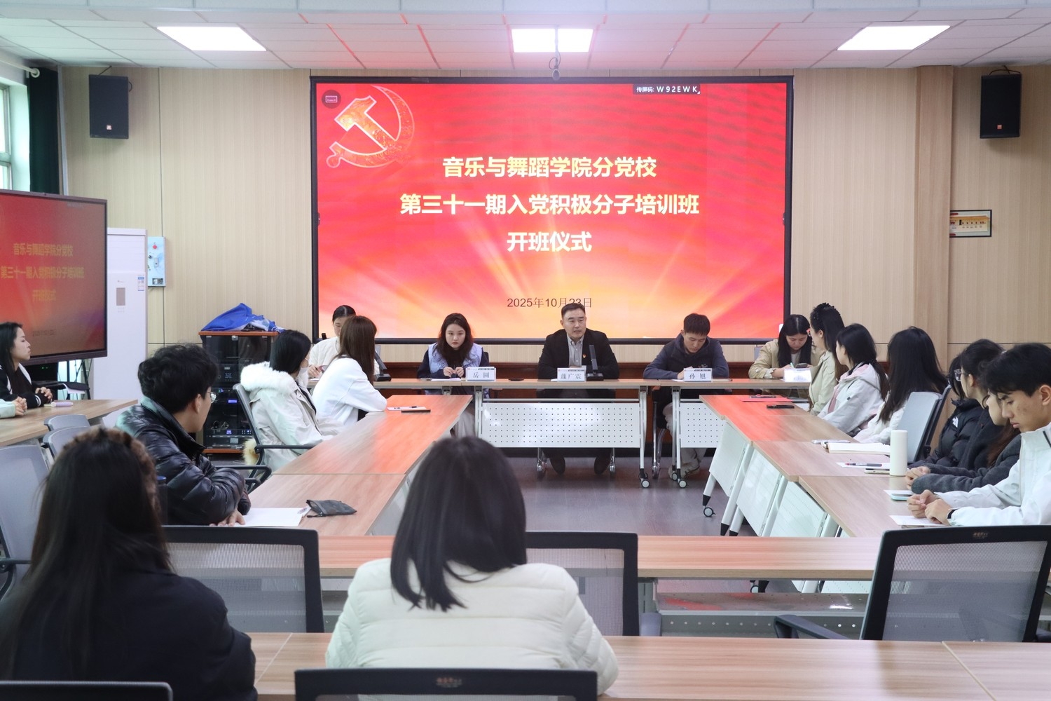 为扎实推进入党积极分子培养教育工作,为党员发展工作筑牢根基,10 月 23 日, 情趣 在 9#205 教室隆重举行第三十一期入党积极分子培训班开班仪式。学院党委副书记蘧广震、组织员王立、辅导员孙旭、岳圆、付衍丹出席开班仪式,全体新确定的入党积极分子共同参与。