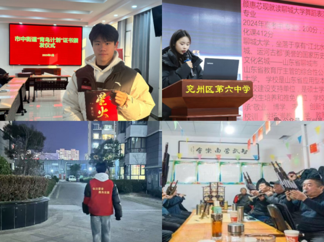 活动期间,阳光志愿服务队的成员们积极投身社会实践,参与了“全国返家乡”“青鸟计划”等大学生志愿者活动,在不同岗位上展现了青春风采。志愿服务队成员颜惠芯利用假期回到母校济宁市兖州区第六中学进行宣讲,向师弟师妹分享了高考奋斗经历与丰富多彩的大学生活,激励师弟师妹共同奋进。志愿服务队成员裴烜丽参与了南乐会传承保护调研实践,通过走访民间艺人,收集珍贵曲谱,深入挖掘南乐会历史渊源,并利用新媒体平台宣传推广,助力这一非遗瑰宝重焕生机。