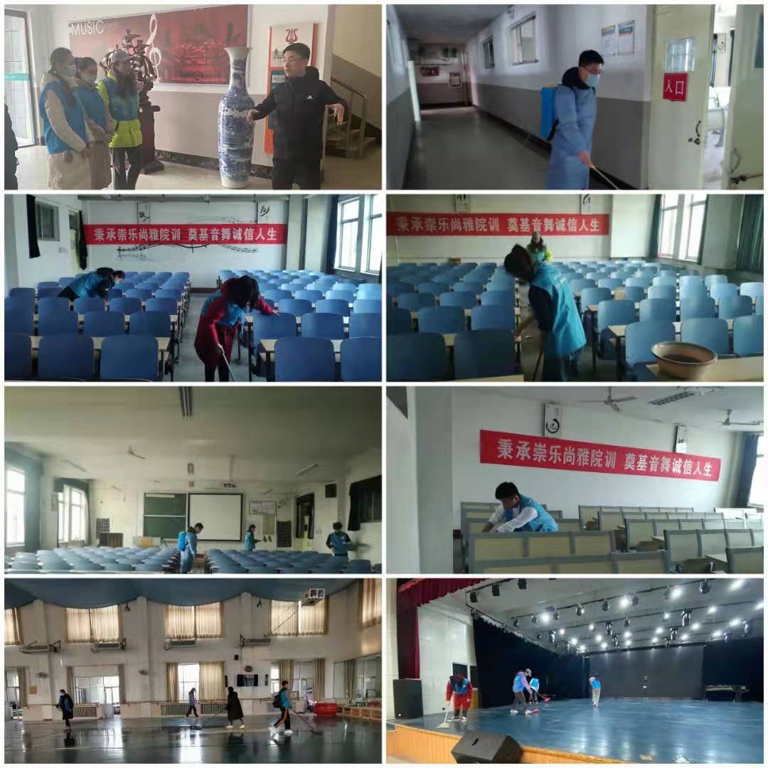 创设优美、整洁、卫生、安全的校园环境,确保全体师生的健康安全,确保学校能够顺利开学,2月26日下午, 情趣 全体辅导员带领17名志愿者对学院办公室、教室、舞蹈房、音乐厅、走廊进行全面的清扫、消杀。