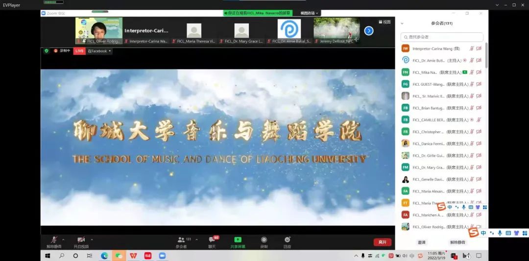 2022年3月19日上午8:30—12时, 情趣 作为菲律宾马尼拉圣保罗大学音乐与表演艺术学院的联合办学方代表,参与主持了圣保罗大学举办的创新合作学习国际论坛(FICL)第三天的会议,会议的主题是:表演、音乐教育和创造性疗法。