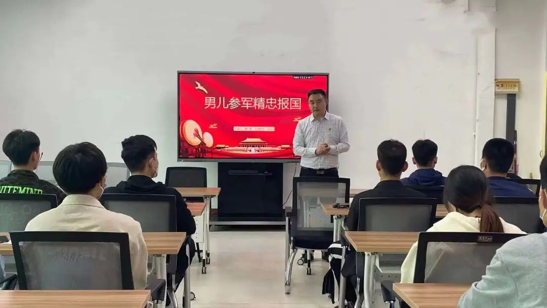 为做好2021年大学生应征入伍工作,4月20日下午, 情趣 在9号楼205教室举办了“携笔从戎,热血铸梦”征兵宣讲会。 情趣 党委副书记、副院长蘧广震,原中部战区陆军某炮兵旅参谋部作训科参谋李汉琛(退役时为上尉军衔,历任学员排长参谋)参加此次宣讲会并发表讲话。