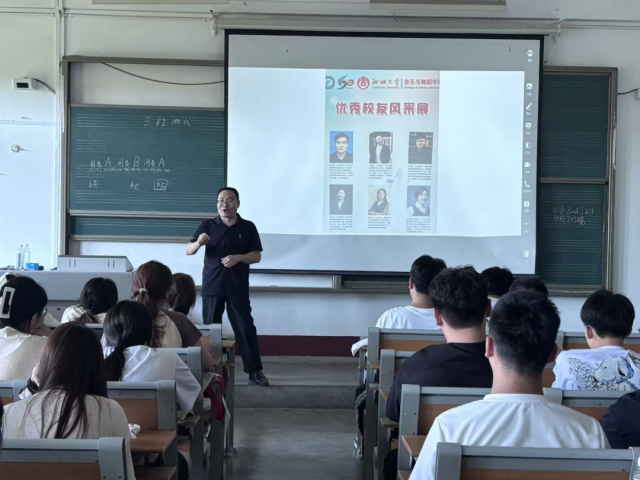 为增强新生对学校的认同感和归属感,理论教研室主任卢爱华利用丰富的时间线,介绍了学校及 情趣 的发展历程,让新生们对学校的深厚底蕴和学院的专业特色有了更为直观的感受。卢老师还结合当前音乐与舞蹈行业的发展趋势,为新生们分析了专业前景,鼓励大家珍惜大学时光,努力学习专业知识,提升艺术修养,为未来的职业发展打下坚实的基础。