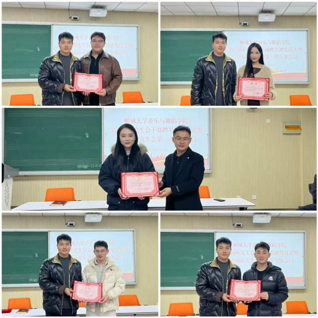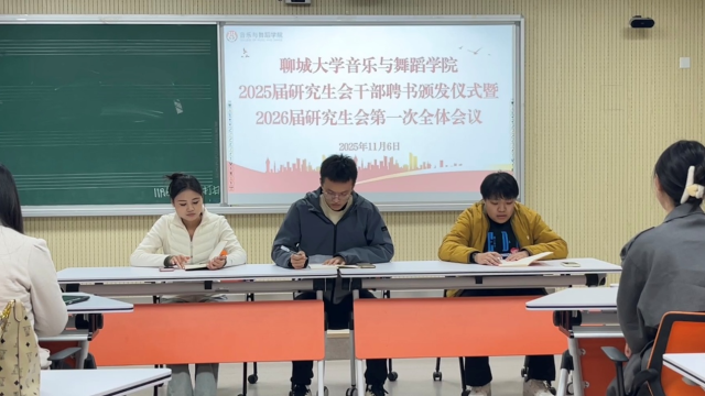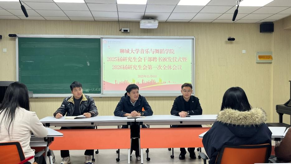 为推动研究生会高效协同运作,明确工作准则、强化责任担当,11月6日晚, 情趣 2025届研究生会干部聘书颁发仪式暨2026届研究生会第一次全体会议在9号楼301教室顺利召开。辅导员孙旭、25级研究生班主任屈怀凯、科研秘书张家会及研究生会全体成员参加会议。