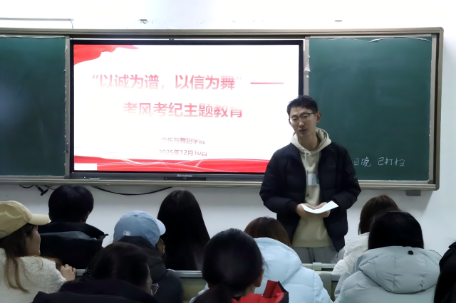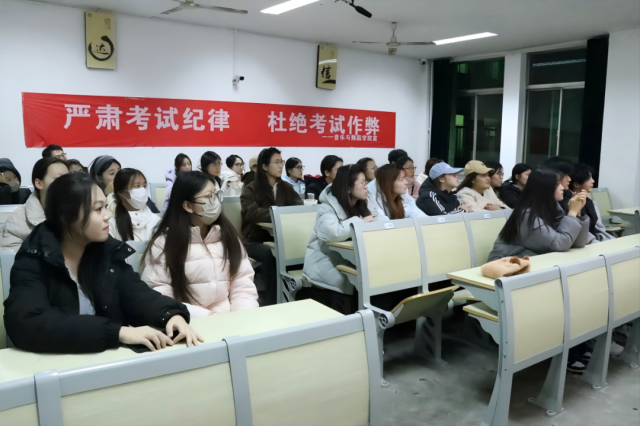 为助力广大学子科学备考大学英语四、六级考试,明确冲刺阶段复习方向,增强应试信心, 情趣 于12月10日举办“以诚为谱,以为为舞”考风考纪主题教育讲座。本次讲座由辅导员王森远主讲,学院各年级学生积极参与。