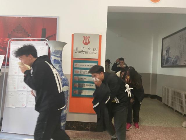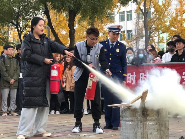 在实地演练中,于聃向同学们介绍并演示了干粉灭火器的正确使用方法,指导部分师生进行了干粉灭火实地操作,并围绕消防安全“四个能力”相关要求先后组织模拟了教学楼和宿舍环境下的火场自救逃生演练,参加演练的同学们根据发现火情——立即报警——初起扑救——疏散逃生等流程,镇定有序的从模拟火场迅速撤离至应急集合点。