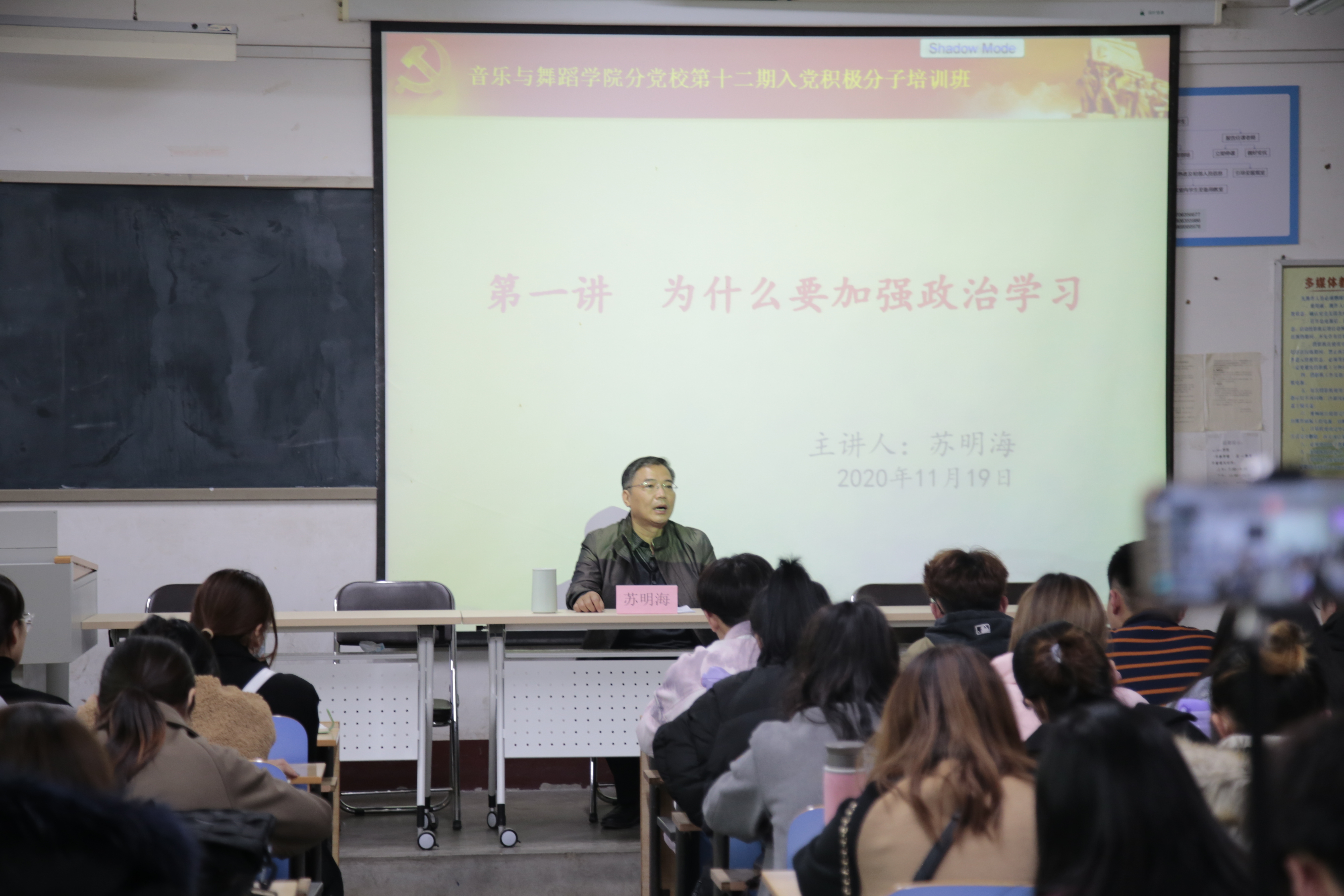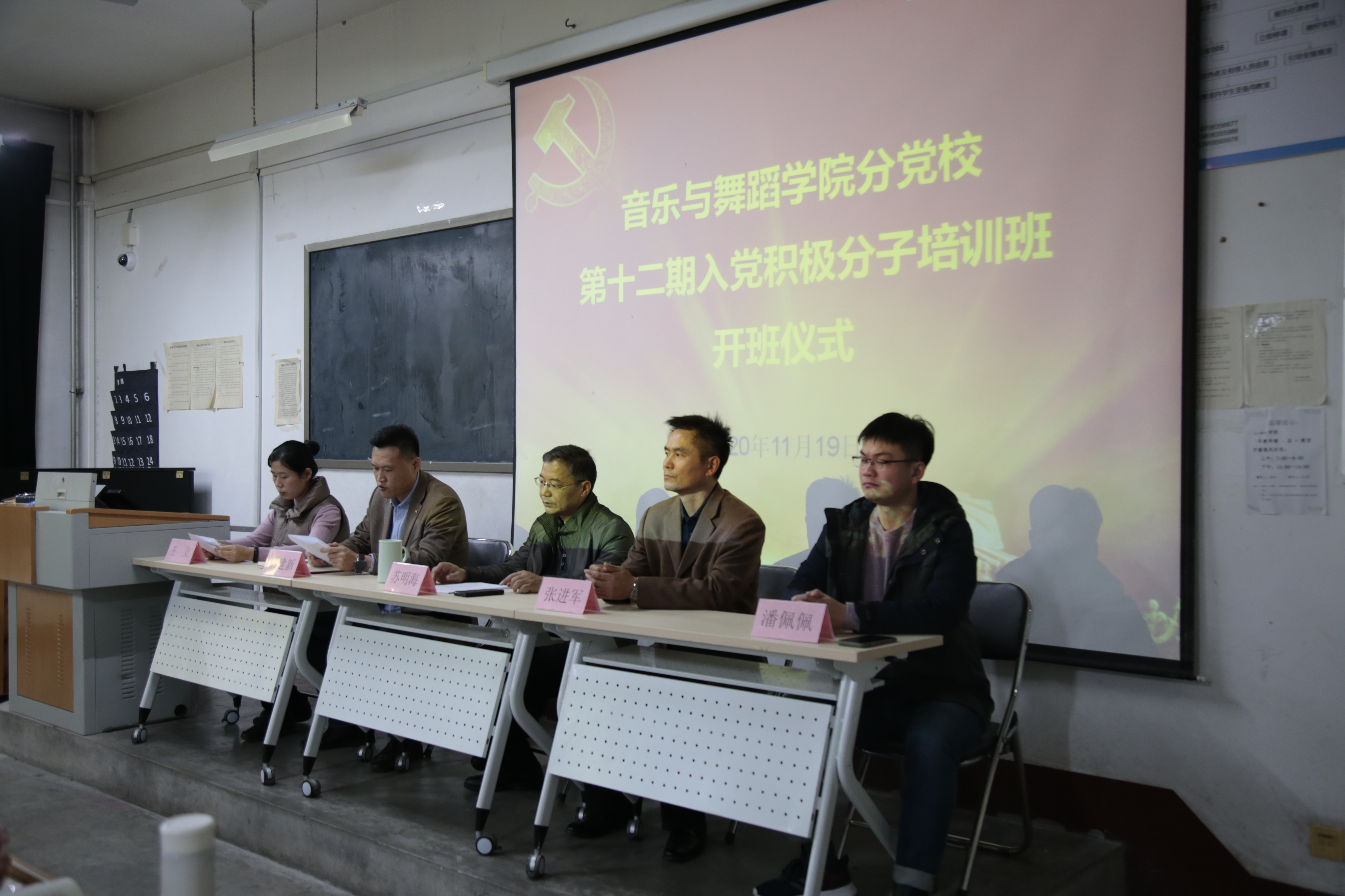 11月19日, 情趣 在9#308举行学院分党校第十二期入党积极分子培训班开班仪式。学院党总支书记苏明海,副书记、副院长张进军,教工党支部书记潘佩佩,学生党支部书记梁建新与全体入党积极分子一起参加了仪式,仪式由学院专职组织员王立主持。