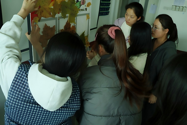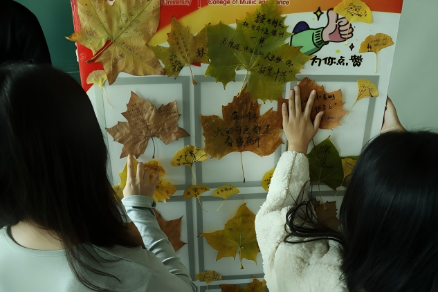 活动现场暖意融融,同学们循着自然的踪迹,精心挑选形态各异、色彩斑斓的落叶。在叶脉的纹路间,大家提笔写下对自己的期许、对亲友的祝福、对生活的感悟,字里行间满是真挚与热忱。随后,一张张承载心意的树叶被细心拼贴在特制展览板上,零散的落叶汇聚成一幅饱含温度的集体作品。在挑选、书写、拼贴的过程中,同学们放慢了脚步,暂时卸下学业压力,在与自然的对话中舒缓身心、安放情绪,收获了片刻的宁静与治愈。最后,大家彼此分享交流,畅谈自己作品背后的创意理念和情绪故事,在轻松愉快的互动中传递积极的心理能量,收获情感的共鸣,释放心理压力。