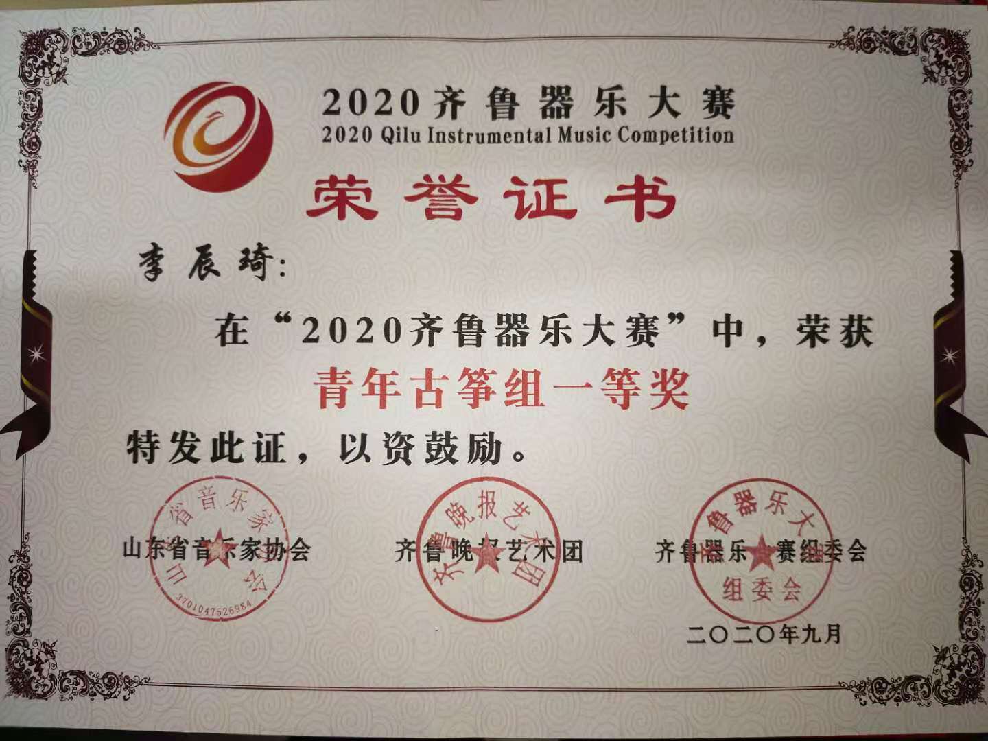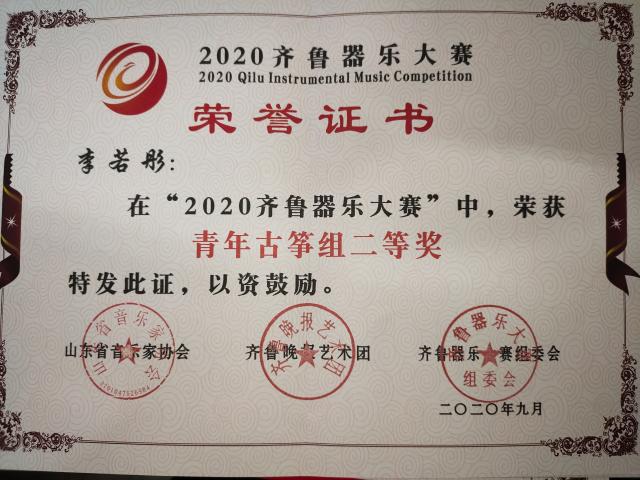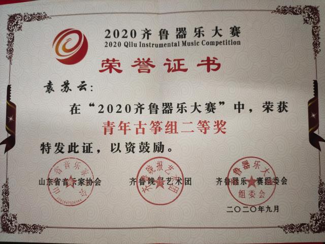 袁苏云,刘圣君,李辰琦,李若彤在2020齐鲁器乐大赛荣获青年古筝组二等奖