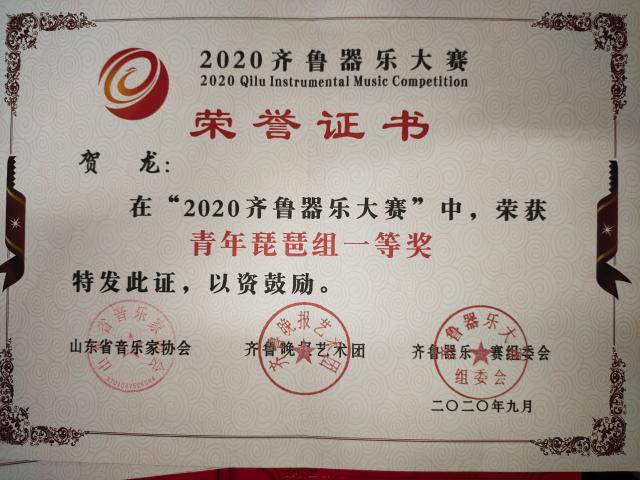 喜报: 情趣 在库学子贺龙在2020齐鲁器乐大赛荣获青年琵琶组一等奖