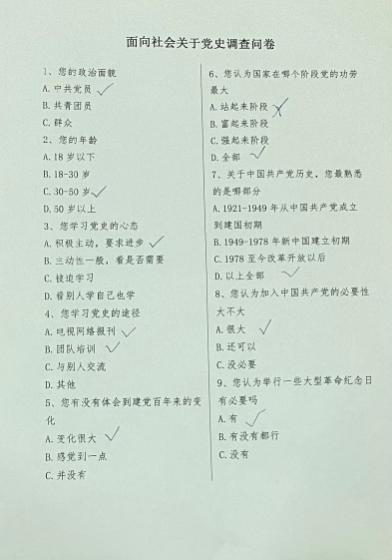 为了更好的推崇学党史要把党的历史学习好、总结好、传承好、发扬好,从百年历程中传承红色基因,调研队成员张贺向周围街坊邻居分发了纸质版调查问卷进行调查,征集了青少年、大学生和社会人群三类调查对象。目的是为了了解不同年龄段不同身份的人对于党史的了解情况。经过调查,一、青少年对于基本的党史是有一定了解并有一定的兴趣,对于青少年来说其主要任务是提起对党的有关兴趣;二、可以看出大学生对于党史是有所学习的,一些关于党历史的问题都基本了解,对于大学生来说学习党史就是基本任务,大学生要做的不仅是学好党史还要将其发扬光大;三、在社会人群中年龄稍长的都是跟党一起经历过来的,对于党他们可谓是非常了解,他们看着国家被党组织着、改变着,对于党他们有着深刻的领悟。