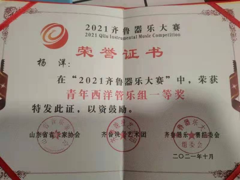 2019级5班杨洋在2021年10月“2021齐鲁器乐大赛”中,荣获青年西洋管乐组一等奖