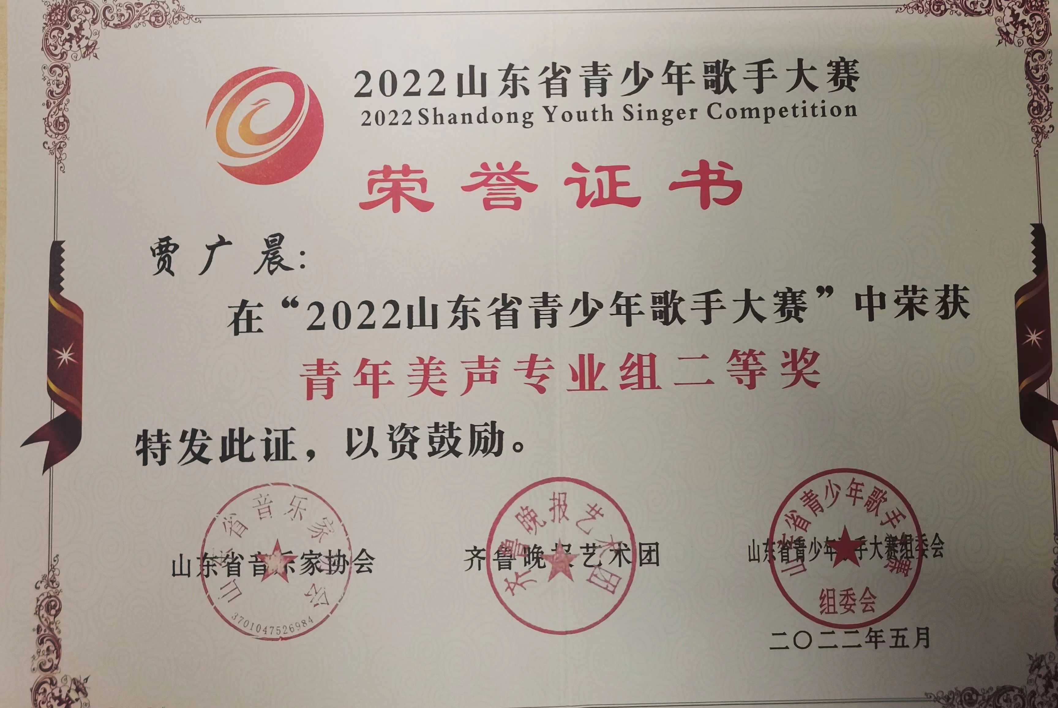 情趣 贾广晨在”2022山东省青少年歌手大赛“中荣获青年美声专业组二等奖