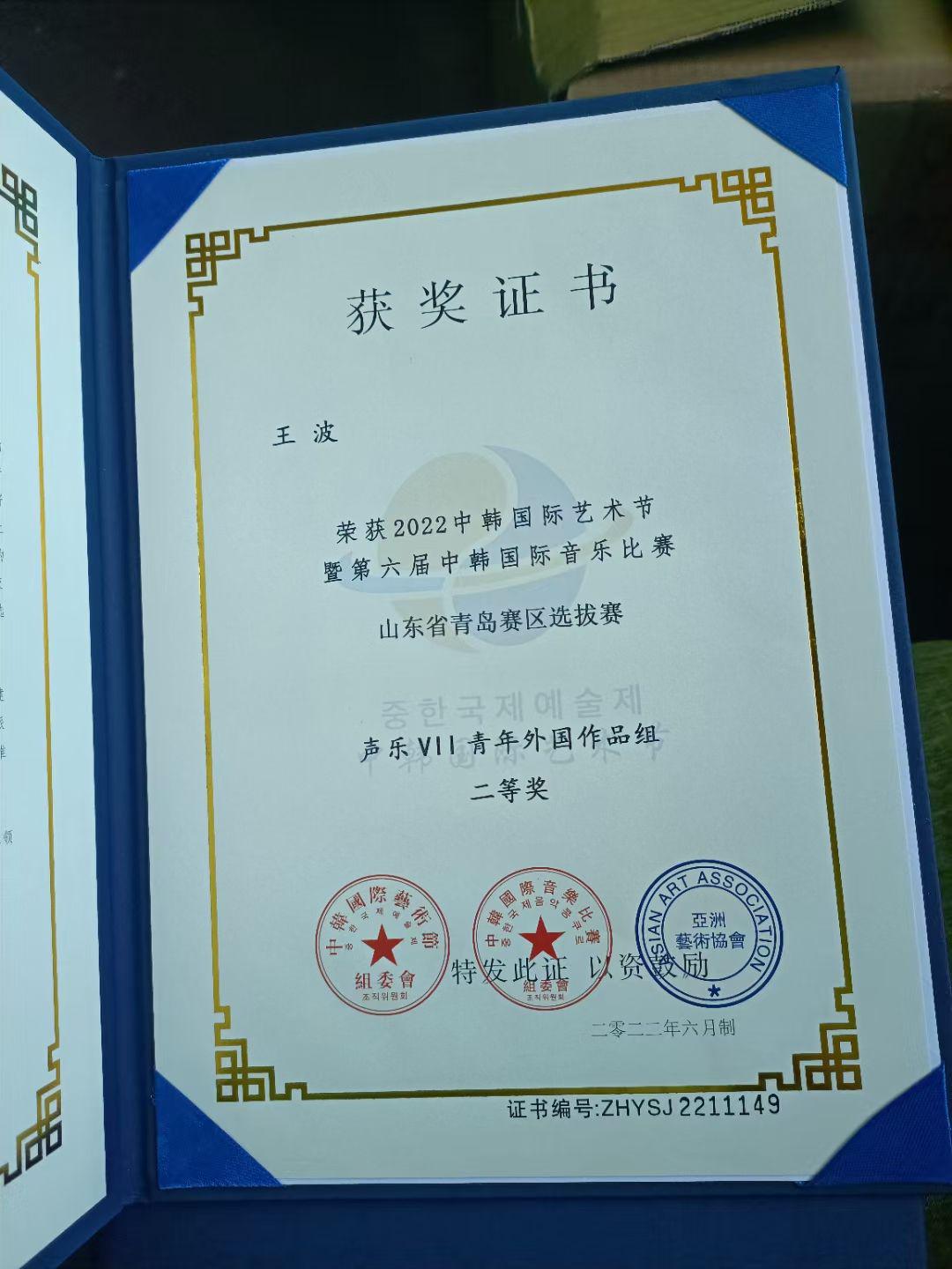 情趣 王波在”2022中韩国际音乐比赛“中荣获青年外国作品组二等奖