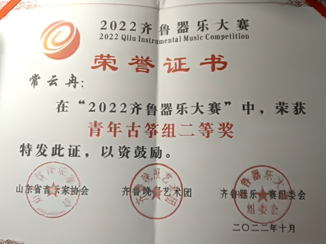 情趣 常云冉在“2022山东省齐鲁器乐大赛”中荣获青年古筝组二等奖