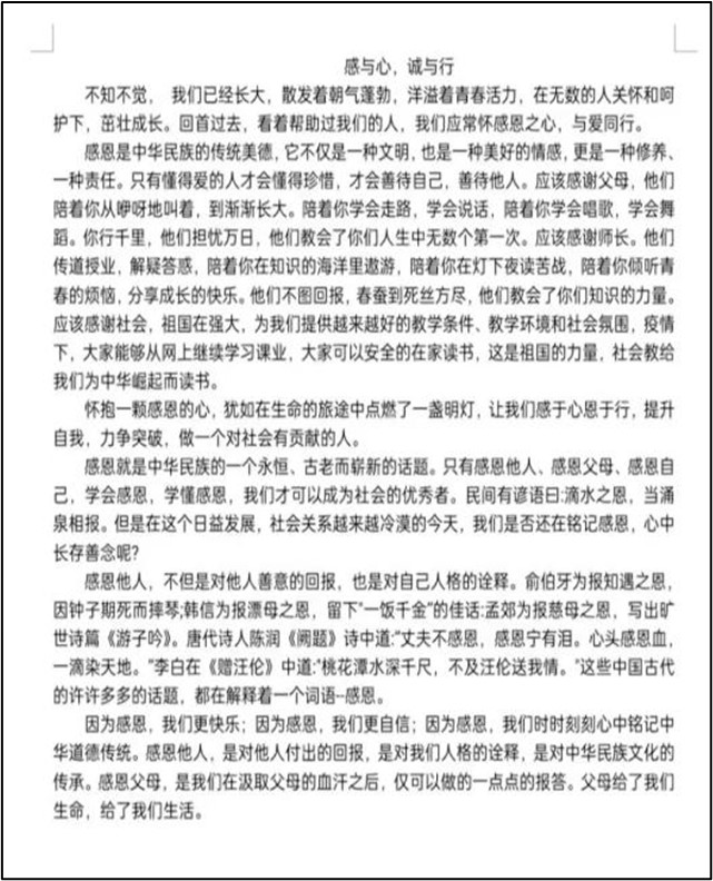 本次征文征集活动以鼓励同学为父母奉献孝心、争做诚信文明青年人为主。培养了 情趣
