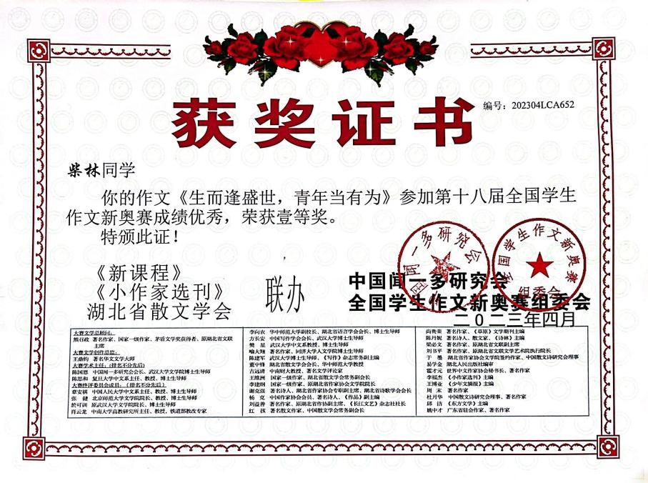 柴林荣获“第十八届全国学生作文新奥赛”一等奖
