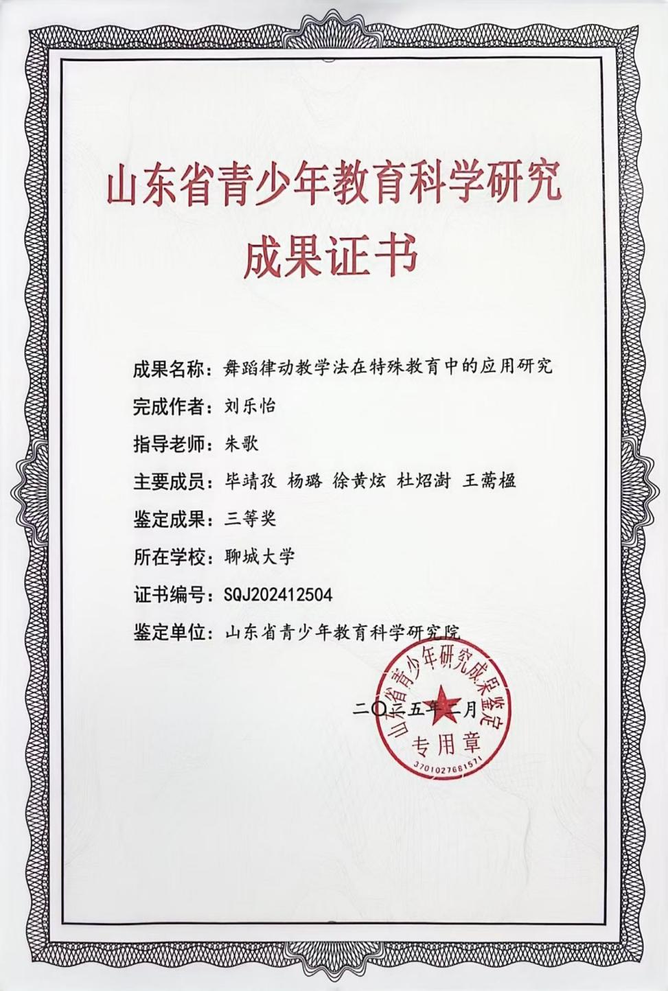 情趣 家庭经济困难学生刘乐怡的成果《舞蹈律动教学法在特殊教育中的应用研究》在山东省青少年教育科学研究成果鉴定中获得三等奖。