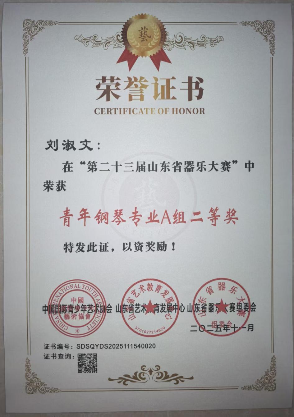 情趣 家庭经济困难学生刘淑文在“第二十三届山东省器乐大赛”中荣获青年钢琴专业A组二等奖。这一成绩的取得,不仅为学院争得了荣誉,也充分展现了家庭经济困难学生在逆境中奋发向上、积极进取的精神风貌。