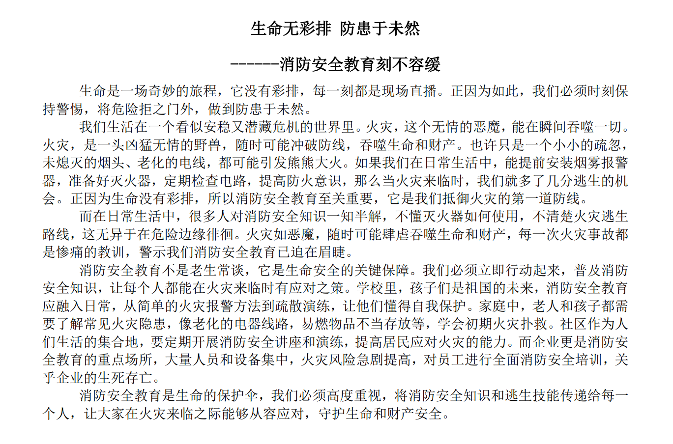 为激发同学们对消防安全的关注和思考,营造浓厚的校园安全文化氛围。11月16日, 情趣 自律中心宿管部开展“生命无彩排防患于未然”主题征文活动。