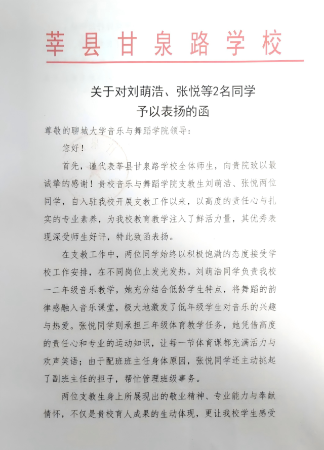 近日, 情趣 收到莘县甘泉路学校发来的《对刘萌浩、张悦等2名同学予以表扬的函》。函中充分肯定了刘萌浩、张悦两位同学在支教期间的优秀表现,并对学院培养出具备高度责任心与扎实专业素养的学生表示感谢。