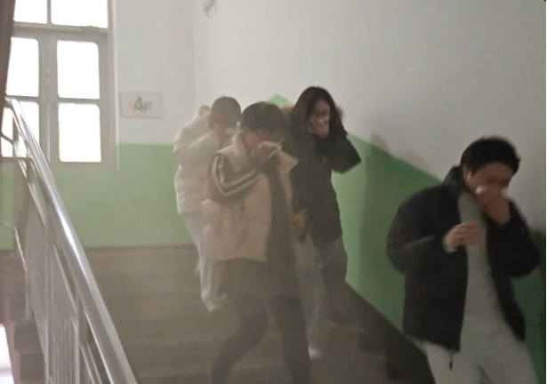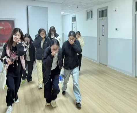 学生公寓安全逃生疏散演练接续展开,全体学生迅速进入应急状态,严格按照消防逃生规范,用湿毛巾捂住口鼻,弯腰低姿,沿指定疏散路线快速、有序撤离。整个过程响应迅速、秩序井然,全员高效完成集结。