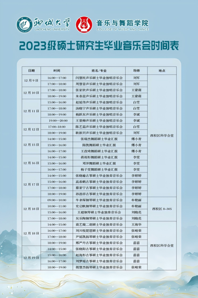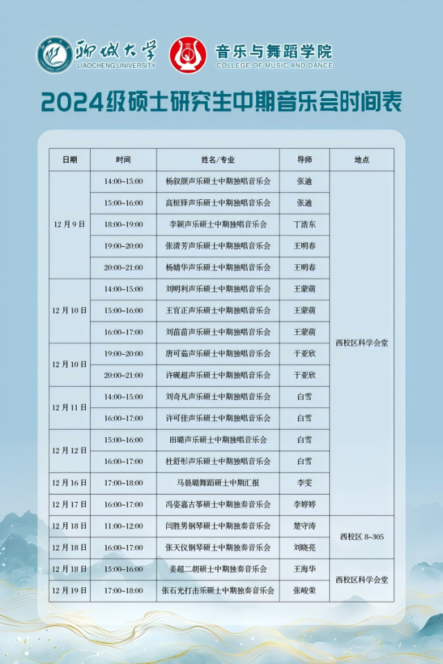 为深入落实硕士研究生培养方案核心要求,扎实推进人才培养质量提升工程,12月9日至19日 情趣 将于在西校区科学会堂、8-305教室分场次有序举办2023级硕士研究生毕业音乐会及舞蹈毕业汇报与2024级硕士研究生中期音乐会及舞蹈中期汇报。