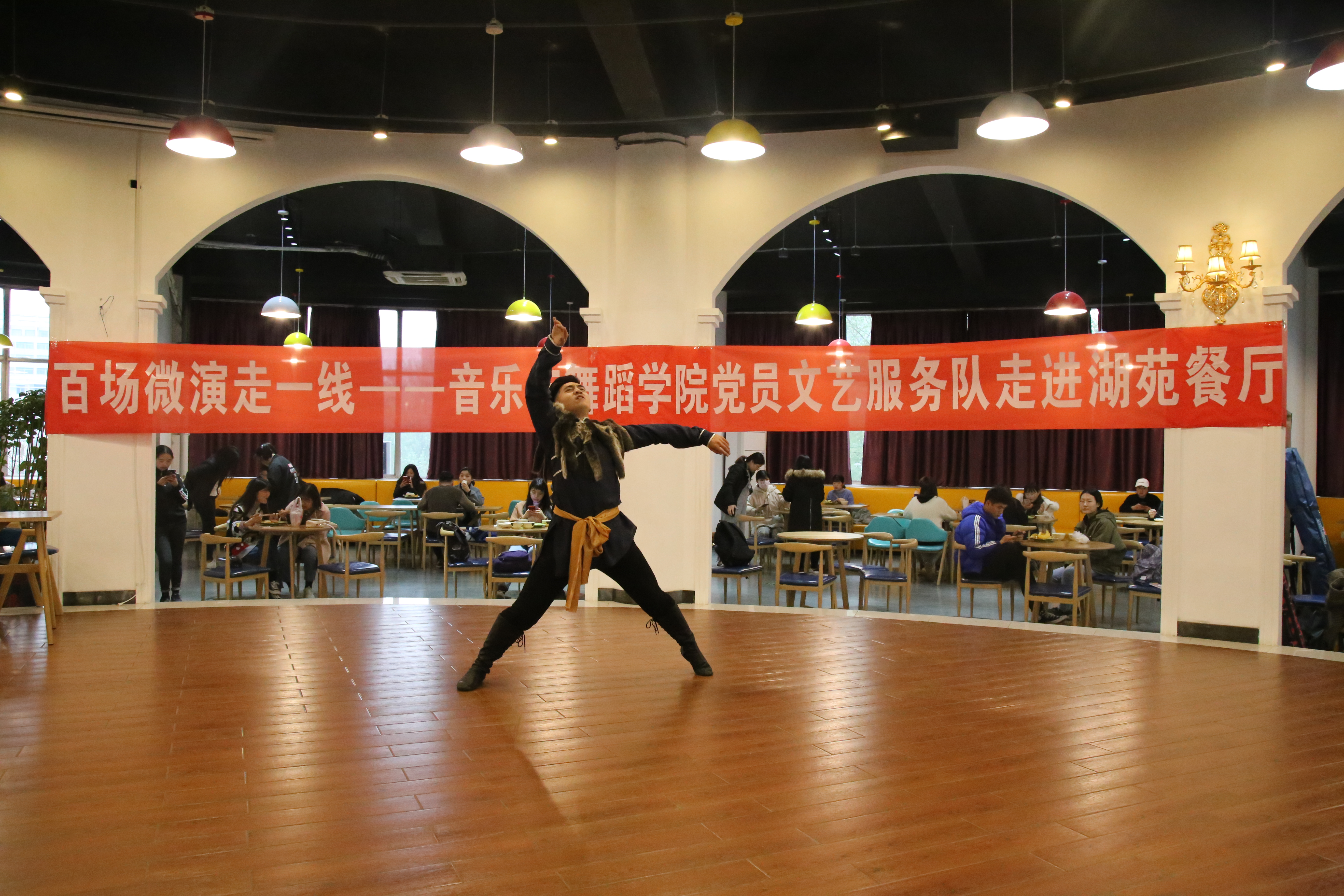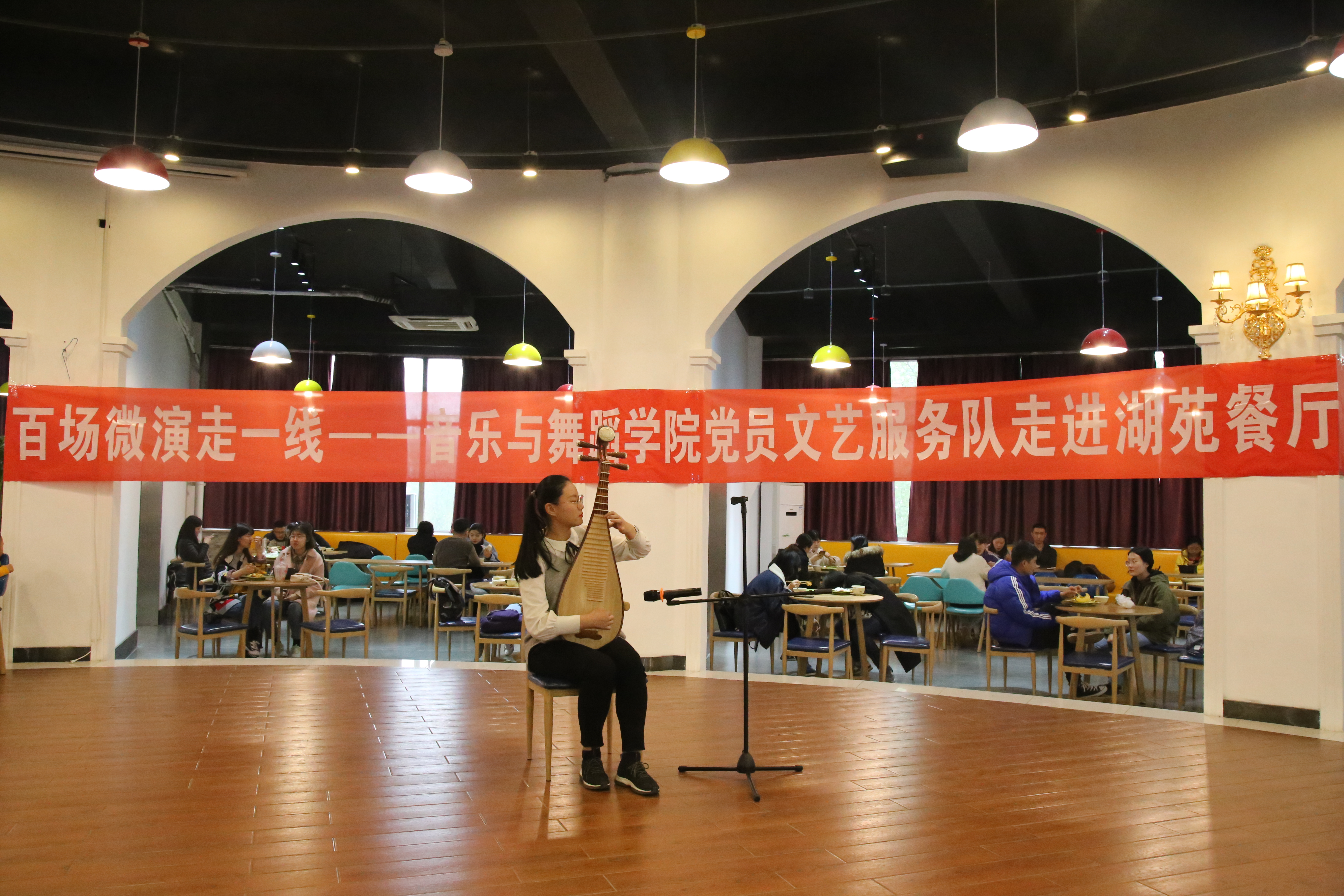 3月29日下午, 情趣 党员文艺服务队走进湖苑餐厅,继续深入开展“百场微演走一线”的活动,在湖苑餐厅为同学们带来了精彩的演出。