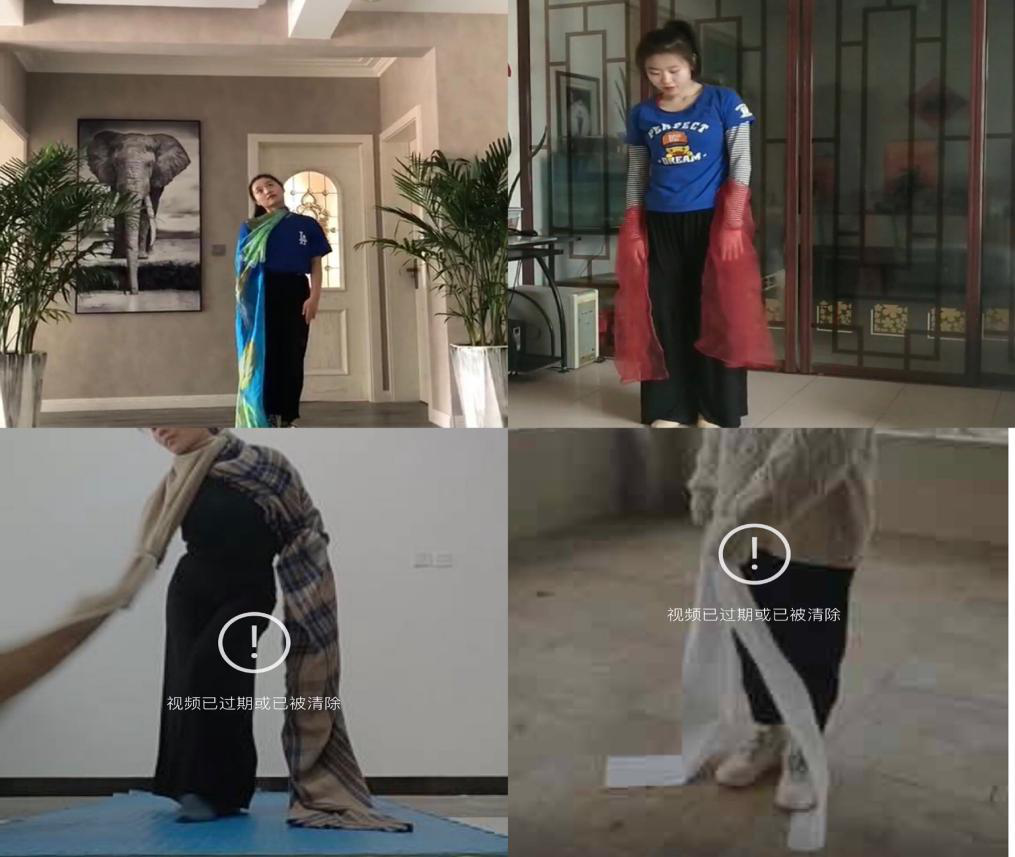 桑文倩老师的中国古典舞身韵第三学期,应融合道具进行训练,我们从众多道具选择了具有代表性的袖舞,通过水袖的舞动与身法的融合,来传达中国古典舞身韵的神韵。由于疫情的影响,学生们手边没有水袖,为了能更好的感受水袖的魅力,同学们发挥想象,选择了与水袖一般柔软材质且具有可舞性的卫生纸、围巾、纱巾、丝巾等进行作业的录制。