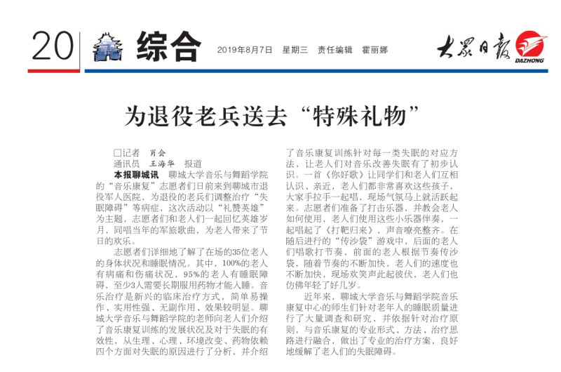 2019年8月7日《大众日报》以《为退役老兵送去特殊“礼物”》为题报道了 情趣 暑期社会实践活动。