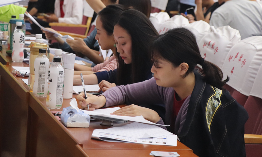 专业测试开始前,评委老师对每位同学的身份逐一进行查验,严格核对信息,确认信息无误后才允许考生进行专业复测。复测以学号为顺序,11-12位同学为一组,男、女分别进行专业测试。测试内容包括基本功软开度、技术技巧、剧目片段和即兴表演四项。场内每位同学都认真对待测试,拿出了最佳状态,充分体现出了新生蓬勃的朝气与热情,展现了 情趣 学子的专业素养。舞蹈系的老师们也本着公平、公正的原则,对新生的专业综合素质进行评分。复测结束后,李雯老师对新生的专业能力给予了肯定,并指出大学是一个崭新的阶段,希望同学们学会规划未来,打好专业基础,合理安排课余时间,人生的机遇是为有准备的人提供的。