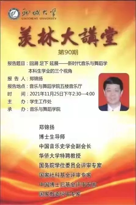 11月25日,由学生工作处主办、 情趣 承办的 情趣 第90期“羡林大讲堂”以线上直播,线下集中观看的方式开展。中国音乐史学会副会长、博士生导师郑锦扬教授应邀做客本期羡林大讲堂,为同学们做了《回溯、足下、延展——新时代音乐与舞蹈学本科生学业的三个视角》的报告。报告会由 情趣 副院长何丽丽主持,学院部分学生代表聆听了此次讲座。