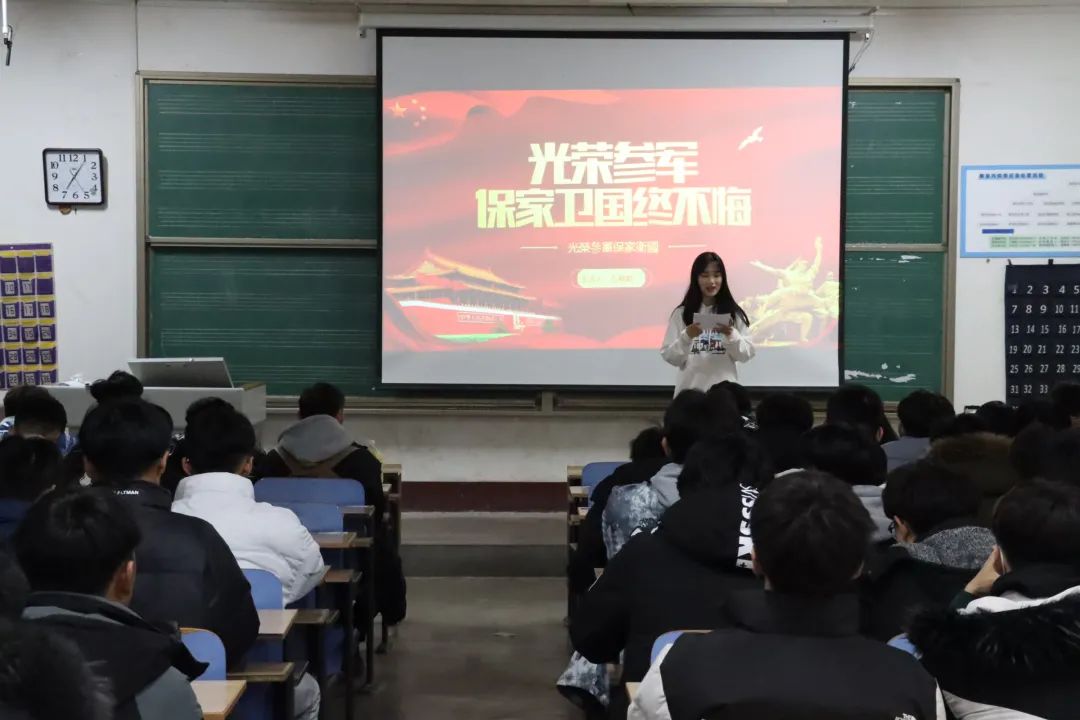为深化十九届六中全会精神学习,进一步弘扬新时代爱国主义精神、践行“担当使命、不怕牺牲、对党忠诚、不负人民”价值理念、鼓励大学生参军入伍,12月19日 情趣 在9#408召开“参军报国,无上光荣”征兵宣讲会。
