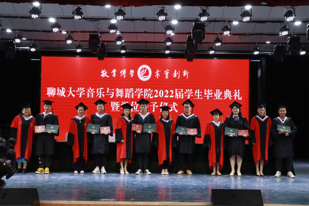 院长尹蕾,副院长牟艳丽、王海华,院长助理王辉,教师闫震、郭伟萍为毕业生进行拨穗礼,颁发毕业证书、学位证书并合影留念。