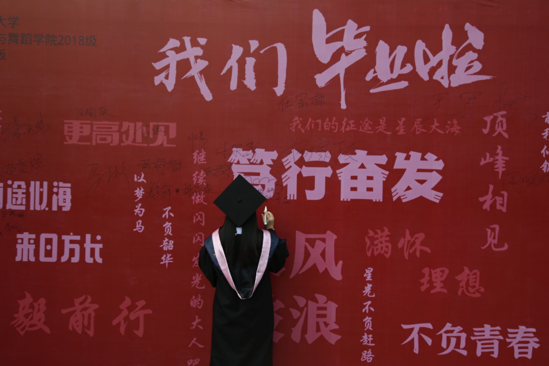 毕业典礼开始前,2022届毕业生们走过红毯,再一次重走4年前进入西校9号楼的那条路,大家在签名墙上留下自己的名字,将记忆定格在这个夏天。