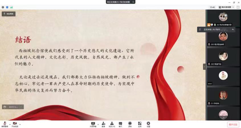 在20级张月的带领下,媒体宣传部所有成员通过线上“红色云展厅”平台集体参观了位于河北省的西柏坡纪念馆。西柏坡,是河北省平山县西部山区的一个小山村,50多年前,一代伟人毛泽东和他的战友们在这里纵横捭阖,运筹帷幄,指挥了震惊中外的三大战役,迎来了共和国的黎明。它是党中央进入北平、解放全中国最后一个农村指挥所,是中国革命史上一座不朽的丰碑。21级刘启明在交流分享环节时表示,新中国的成立,离不开每一位英雄前辈的无私奉献,我们更应该传承和发扬这伟大的精神,把红色精神永记心间。