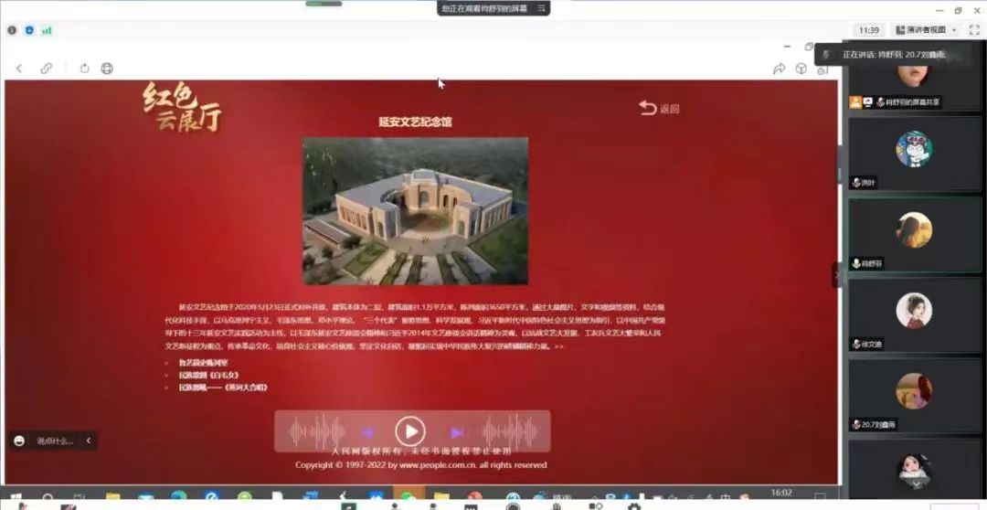 跟随“红色云展厅”的指引语音引领,权益服务部首先游览了鲁艺简史陈列室,从中体会到鲁艺的创办和发展,激励学生坚定中国文学艺术事业的信念;还欣赏了民族歌剧《白毛女》,歌剧生动形象的表现了劳动人民不奋起反抗旧制度,非但不能改变苦难的命运,反而会被旧社会所吞吃;在一声声《黄河大合唱》的民族怒吼中,深深感受到了中国人民保卫祖国、顽强抗击侵略者的爱国精神。