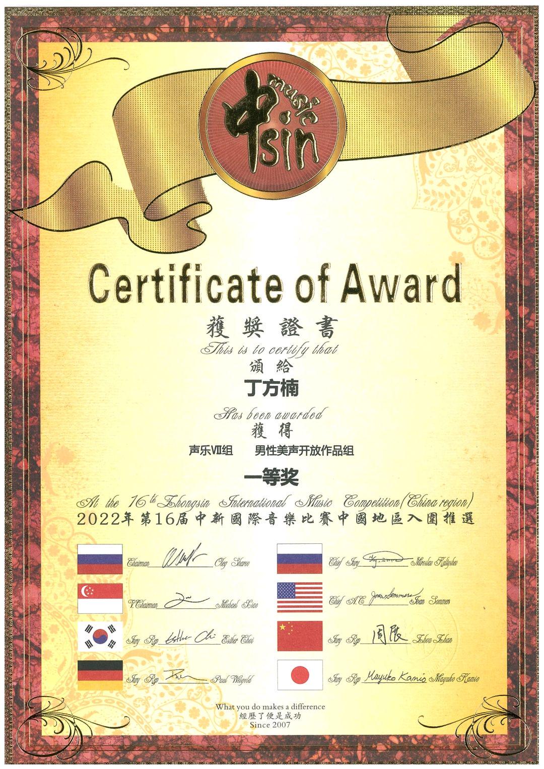丁方楠在第十六届中新国际音乐比赛美声开放组荣获一等奖