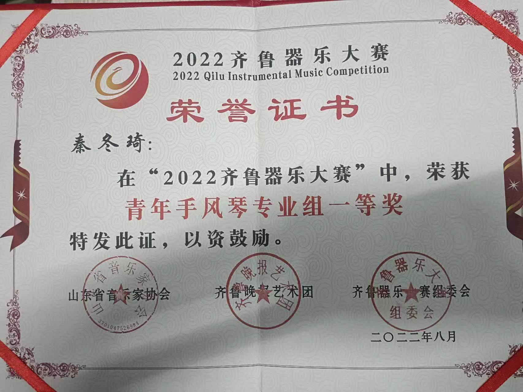 秦冬琦在2022齐鲁器乐大赛中,荣获青年手风琴专业组一等奖。