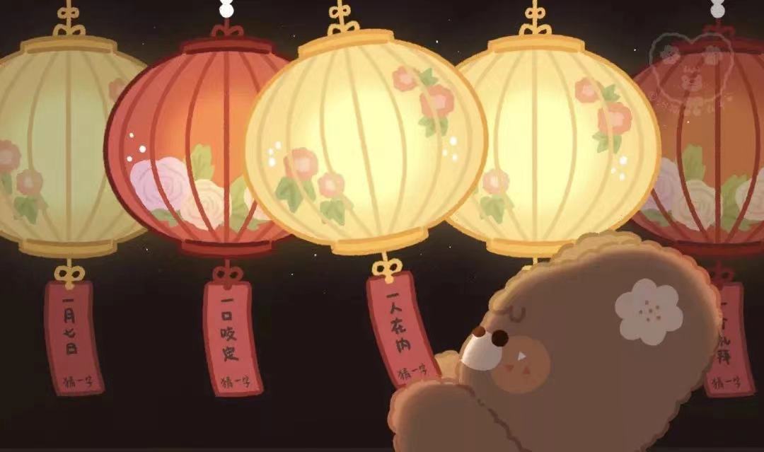 “猜灯谜”又叫“打灯谜”。元宵节里张灯结彩,猜灯谜给喜庆的日子增添了不少雅趣。有人把谜语写在纸条上,贴在五光十色的彩灯上供人猜,以灯悬谜,所以叫“灯谜”。