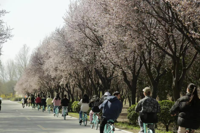 骑行者们穿梭在花海中,在乐享春光赏美景的同时,也体现了绿色健康生活的新风尚,丰富了老师们与同学们的日常生活。