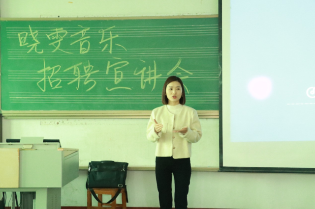 宣讲开始,晓雯音乐的负责人详细介绍其企业背景、情趣等相关信息,并着重介绍了其企业的培训机制、职位发展前景、薪资待遇和晋升渠道等,最后以晓雯音乐的“情趣与信仰”、“办学理念”几个方面进行深入讲解,面向同学们所就读的专业,负责人介绍了相关岗位以及薪酬福利等信息。让同学们对晓雯音乐有了更加深刻的了解。