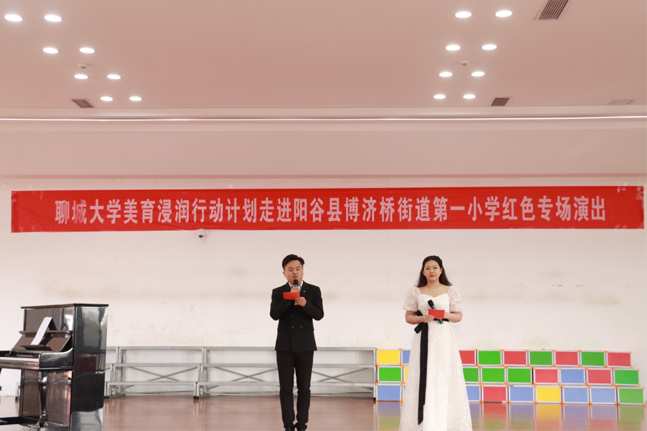 演出在歌曲《唱支山歌给党听》中拉开帷幕,“唱支山歌给党听,我把党来比母亲”,悠扬的钢琴伴奏,富有感情的歌声,感染了现场的每一位观众;舞蹈《映山红》《活着1937》以经典红色故事为支撑,配合音乐与舞蹈动作组合,展现出不同时期人们的革命精神,尤其是《活着1937》,使在场的观众潸然泪下;在同学们好奇的目光中,单簧管、古筝、小军鼓、手风琴等各具特色的乐器一一登上舞台,“讲解+演奏”的模式带同学们进一步认识了这些乐器,同时也欣赏了《沂蒙山小调》《黄河协奏曲》《黄河》等经典曲目。在互动环节,志愿者将传统曲艺快书搬上舞台,它以说唱为主,语言节奏性强,不受场地限制,可随时演出,迅速地反映现实生活,具有独特的艺术效果,《欢声笑语》引得现场掌声雷动,笑声不断;朗诵《强渡黄河、千里跃进大别山》将刘邓大军顽强拼搏的精神呈现在大家面前;歌曲《公仆赞》唱出了聊城人孔繁森的美德,一尘不染两袖清风的好干部,热爱人民、无私奉献的精神;《绿水青山》唱出当代青年对美丽中国的歌颂;一首“吾为中华,天埑无涯,山河无恙,吾国万疆”的《万疆》引发全场大合唱,同学们稚嫩的童声传达出对祖国深深的爱。在演出尾声,全体参演人员齐唱《不忘初心》,同学们也跟着旋律一起挥手跟唱,活动在欢快的气氛中落下了帷幕。