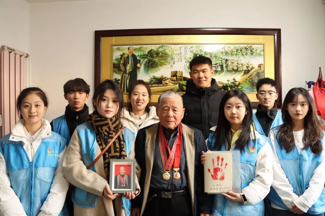 为了留住英雄的光辉形象, 情趣 志愿服务队为王明亮爷爷准备了一份特殊的礼物,现场进行肖像照拍摄。王爷爷戴上他的奖章,在镜头里透出来坚毅的神情,虽然89岁高龄,但戴上奖章的他依然坐的笔直。随后,肖像照现场打印出来,队员们将照片放入准备好的相框里,送给了王爷爷。同时为了传承王爷爷的红色精神,志愿服务队还准备了印泥、记号笔、卡纸等,为王爷爷留下了他的手印,王爷爷为服务队的同学们亲笔写下了:好好学习,天天向上这一美好祝愿。
