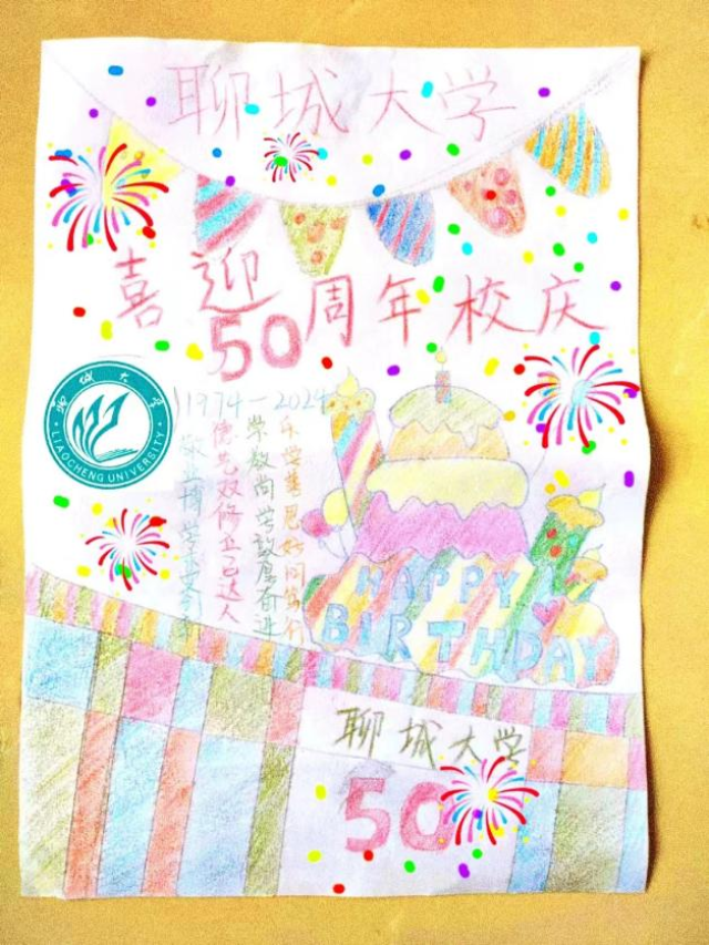 “聆韵”志愿服务队队员李春慧用彩笔绘制了大学的校徽、校训,每一笔每一划,都倾注了对 情趣 的热爱与感激。借用蛋糕来展现 情趣 师生五十年来的辉煌历程以及丰硕的研究成果,画面最下方所描绘的学校校门则托起了无数聊大学子的求知梦!
