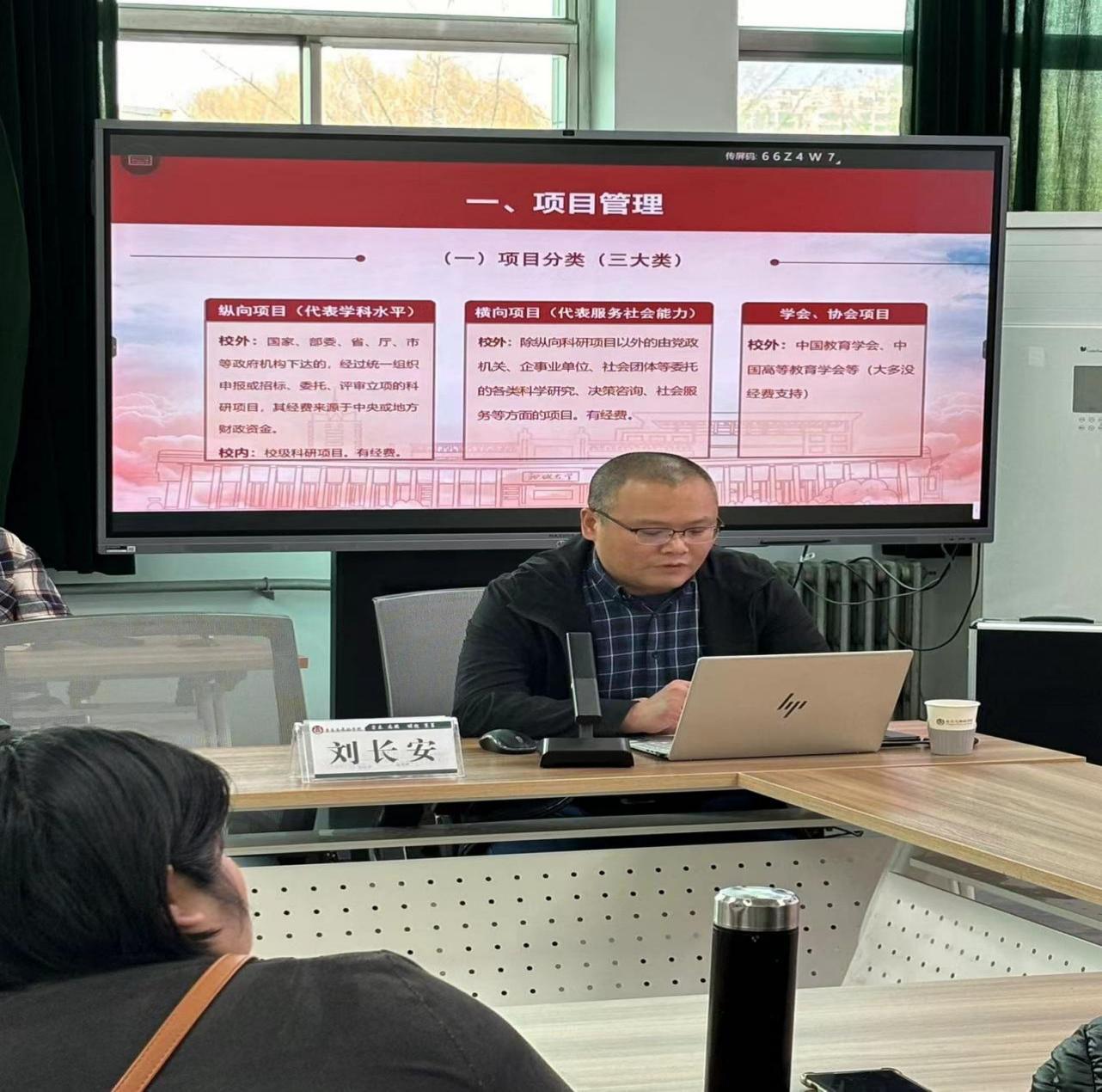 刘长安讲解了哲学社会科学研究项目设立情况、选题以及申报书的撰写,着重讲述了各级项目的分类、申报,分享了项目申报的六大技巧等。他对 情趣 2023年科学研究工作情况做了详尽的分析,对学院科研存在的问题及发展提出了建设性意见和建议。