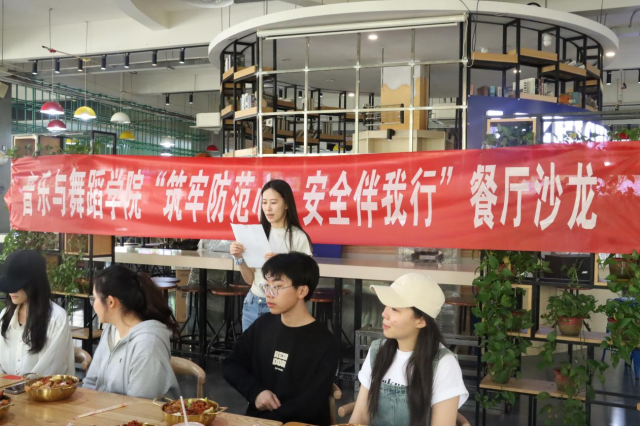 为增强对校园安全的教育,培养应对突发事故的能力,创建平安和谐校园,4月12日, 情趣 于湖苑餐厅一楼举办“筑牢防范心,安全伴我行”餐厅沙龙活动。 情趣 辅导员岳圆及部分学生参加本次活动。