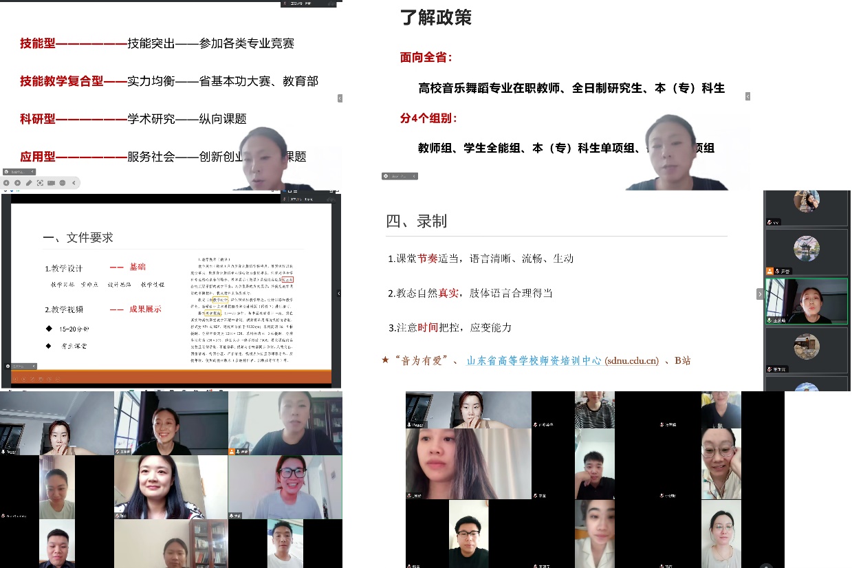 尹蕾院长结合学院青年教师的专业背景和特点,提出青年教师在职业生涯中要有自己的准确定位和长期规划,从技能型、技能教学复合型、教学科研型等不同赛道长期坚持努力、不断自我突破。她强调,山东省第九届高校音乐舞蹈专业师生基本功展示活动即将举行,这是青年教师的一次重要锻炼机会,希望老师们抓住机遇实现自我超越。随后,她对竞赛政策、备战安排进行了说明部署。王蒙萌根据自己参赛经验,围绕微课要求、教学选题、内容与设计和录制视频等几个方面进行了分享。