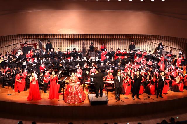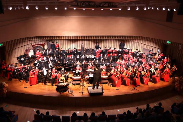 音乐会以声乐与交响《灯火里的中国》拉开序幕。在宏大的民族管弦乐伴奏下, 情趣 6位声乐教师深情演绎,描绘出一幅奋进中国的温暖画卷,表达了对祖国的深情祝福。随后的古筝协奏曲《云裳诉》、竹笛协奏曲《雪意断桥》、琵琶协奏曲《云想花想》等经典民族器乐作品依次登场,古筝清丽的泛音和柔美的摇指再现盛唐气象;笛音婉转悠扬的旋律勾勒出西湖“断桥残雪”的唯美意境;琵琶丰富的音色变化与交响化的音乐叙事展现了盛唐的瑰丽想象与“诗仙”李白的浪漫情怀。之后,两件特色民族乐器柳琴与尺八分别与乐队协奏,行云流水般演出的《春到沂河》《望你早归》将音乐会推向高潮。音乐家王惠然对柳琴的改良,演奏家刘哲对尺八的双创,令人印象深刻。