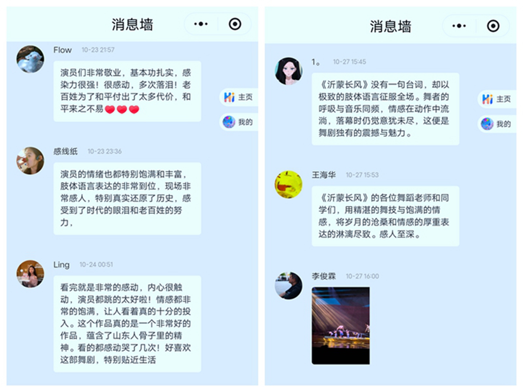 为进一步深化演出的育人价值, 情趣 以此次公演为契机,组织开展 “舞剧《沂蒙长风》观后感分享” 主题思想政治教育活动,引导师生从红色艺术中汲取精神力量,将沂蒙精神融入学习与工作中。有的评价分享道:“演员们非常敬业,基本功扎实,感染力很强!很感动,多次落泪!老百姓为了和平付出了太多代价,和平来之不易”“没有一句台词,却用极致的肢体语言征服全场,舞者的呼吸与音乐同频,情感在动作中流淌,落幕时仍觉意犹未尽,这就是舞剧独有的震撼与魅力”;还有的谈道:“演员情绪饱满,肢体语言到位,真实还原了历史,让我们看到了时代的眼泪与老百姓的努力”“作品里蕴含了山东人骨子里的精神,看的特别感动,哭了好几次”。
