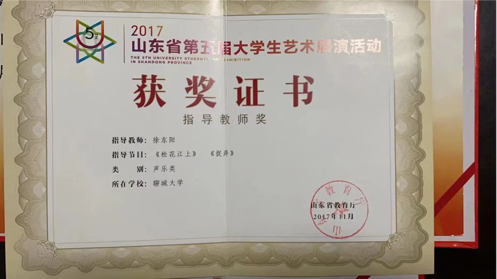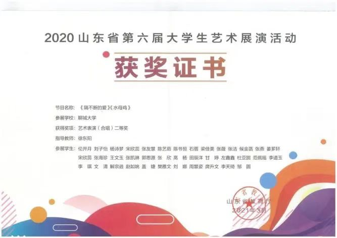 2020年11月16日,参加山东省第六届大学生艺术展演获二等奖。